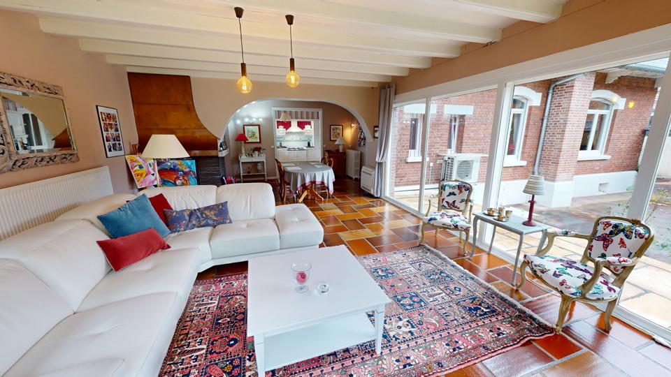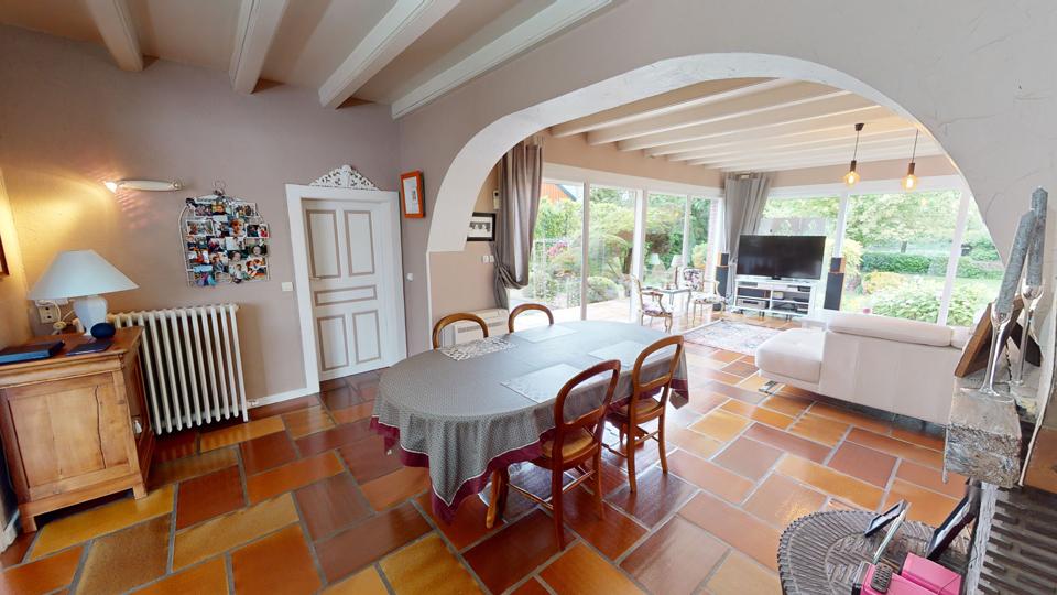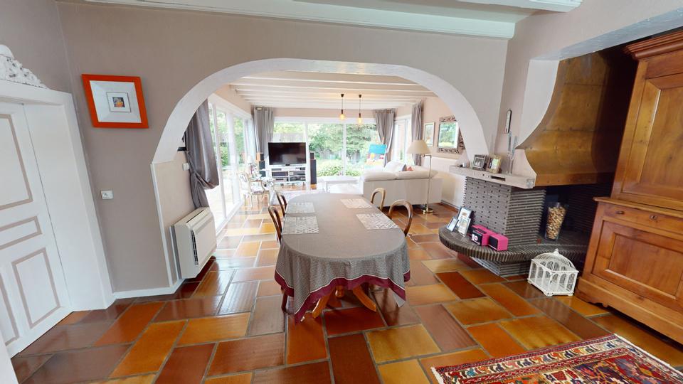 Séjour avec cheminée (avec insert Godin) et accès à l'extérieur via de larges baies vitrées |
